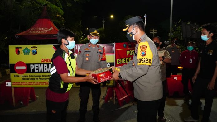 Sidoarjo, memorandum.co.id – Di tengah patroli pemberlakuan pembatasan kegiatan masyarakat (PPKM) level 4 di wilayah Tulangan dan Krembung, Sabtu (7/8/2021) malam, Kapolresta Sidoarjo menemui sejumlah penjual makanan dan pedagang yang masih berjualan di atas pukul 21.00