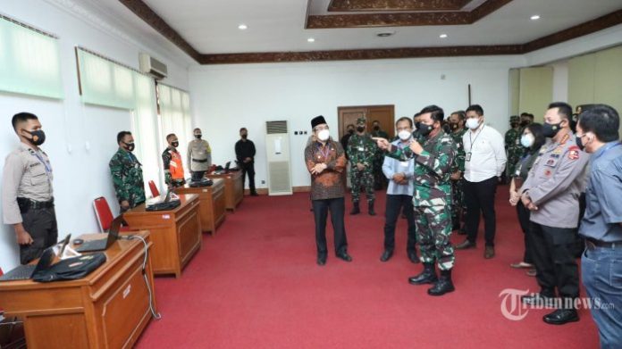 JAKARTA – Panglima TNI Marsekal Hadi Tjahjanto bersama Kapolri Jenderal Polisi Listyo Sigit Prabowo memimpin rapat dengan unsur Forkopimda terkait penanganan Covid-19 di Kabupaten Sleman, Daerah Istimewa Yogyakartabdi Kantor Pemkab Sleman pada Minggu (8/8/2021).