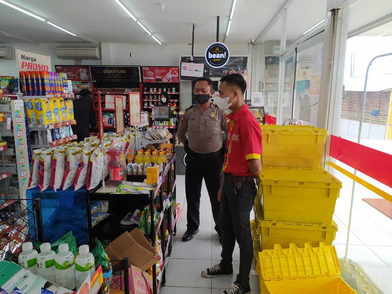 Personel Polsek Wiradesa Bripka Aji Wijayanto dan Bripda Hernaedi melaksanakan patroli dialogis sampaikan himbauan protokol kesehatan terhadap para pemilik toko dan karyawan minimarket diwilayah Kec. Wiradesa Kab. Pekalongan, Sabtu (21/8/2021).