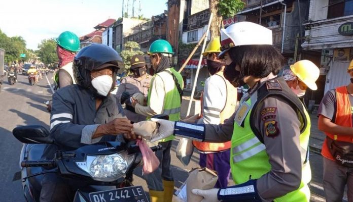 Polwan Polres Gianyar memberhentikan satu persatu kendaraan yang melintas di jalan Ngurah Rai Gianyar untuk diberikan masker dan makanan gratis.