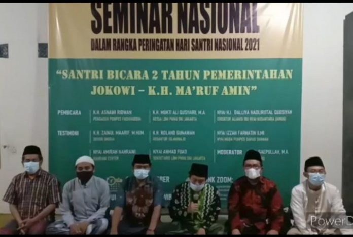 Hal itu mengemuka dalam sebuah seminar nasional bertajuk “Santri Bicara 2 Tahun Pemerintahan Jokowi-KH Ma’ruf Amin” yang digelar pada Rabu (20/10)  dan  dimoderatori oleh Kiyai Saepullah MHum. Acara yang digelar atas kerja sama Pondok Pesantren Fashihuddin Depok, Paguyuban Santri Nusantara (PSN), Aliansi Ibu Nyai Nusantara (AINUN) dan Lembaga Bahtsul Masail Pengurus Wilayah Nahdlatul Ulama (LBM PWNU) DKI Jakarta,  ini adalah seminar dalam rangka peringatan Hari Santri Nasional 2021.