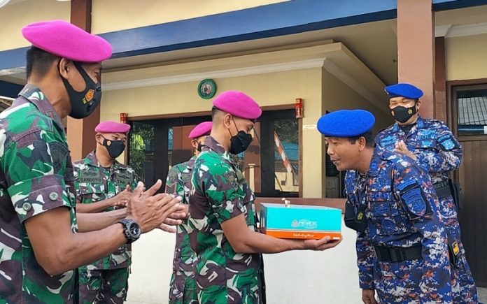 Bitung – Dalam rangka Hari Ulang Tahun (HUT) Ke – 71 Tahun Polairud, Prajurit Marinir Bitung memberikan Surprise Ucapan dan Pemberian Kue kepada Personel Dinas Jaga di Markas Komando Polairud, Tandurusa Kec. Aertembaga Kota Bitung. Rabu (01/12/21)